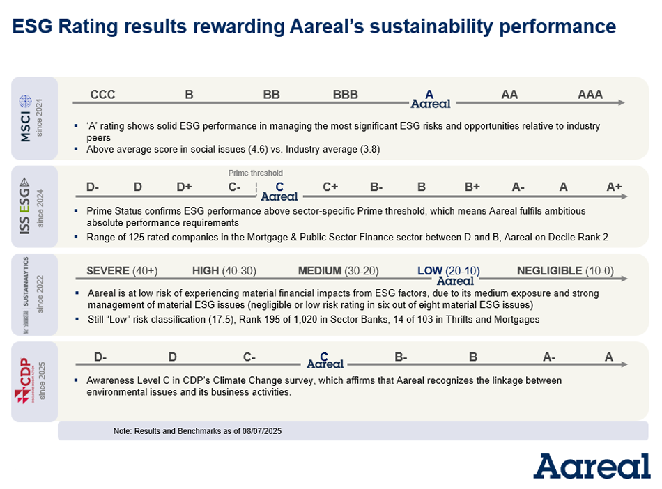 Die Aareal Bank nimmt regelmäßig an den führenden ESG-Ratings MSCI, ISS ESG, Morningstar Sustainalytics und CDP teil. Die zugrundeliegenden Bewertungsmodelle und die erreichten Ergebnisse sind für uns ein wesentliches Instrumentarium, um unsere Nachhaltigkeitsleistung anhand qualitativer und quantitativer KPIs zu messen und diese kontinuierlich weiter zu verbessern.