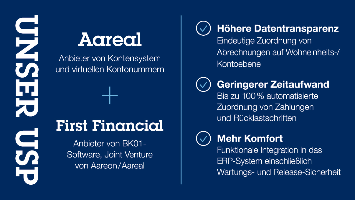 Nicht nur für Unternehmen in der Wohnungswirtschaft unverzichtbar: Ein effizientes Zahlungsmanagement optimiert Liquidität, senkt Kosten und stärkt sowohl Geschäftsbeziehungen als auch Kundenbindung im Firmenkundengeschäft. Nutzen Sie die Möglichkeiten der branchenspezifischen Kontosystematik der Aareal Bank und die virtuellen Kontonummern, indem Sie es mit dem BK01-Lösungsangebot der First Financial Software GmbH kombinieren. Optimieren Sie Ihren Zahlungsverkehr zwischen Bankkontosystem und Unternehmenssoftware – entlang ihrer branchenspezifischen Bedürfnisse: